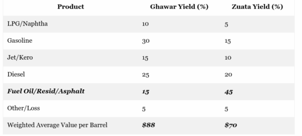 To wit, fully 45% of the refinery yield from Zuata heavy oil consists of low-value fuel oil, residual oils and asphalt, while the high-value light fraction yield (LPG/Naphtha, Gasoline, Jet/Kero) is just 30%. By contrast, the light fraction yield from the Ghawar crude is upwards of 55%, as shown in the table below.
