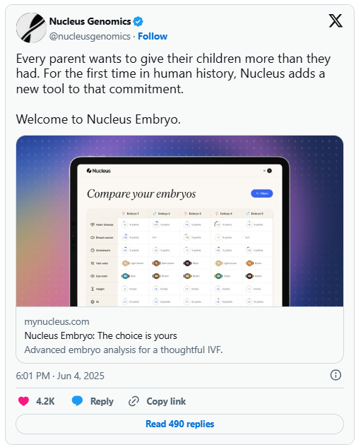 Nucleus IVF+ technology is said to allow couples to optimize a baby who's smarter, taller, and healthier than embryonic siblings, who are disposed of. In other words, it's eugenics.
