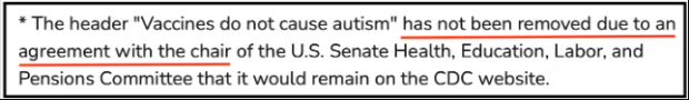 Remarkably, the CDC states that the headline phrase remains on the page only “due to an agreement with the chair of the U.S. Senate Health, Education, Labor, and Pensions Committee.”