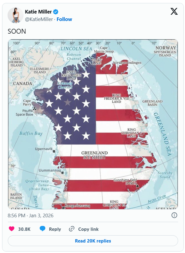 Sachs was convinced that Trump’s sudden attack on Venezuela would probably soon be followed by his seizure and annexation of Denmark’s Greenland, a plan of American territorial expansion that he had heavily promoted during the early months of his presidency. Stephen Miller ranks as one of Trump’s most powerful advisors, and just yesterday his wife Katie Miller tweeted out an image of that large island covered in the American Stars-and-Stripes, headlined by the single word “SOON.” Her social media post attracted more than twenty millions views: