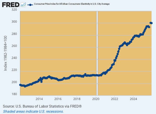 Needless to say, the political hot potato of “affordability” does very much come to mind when you take a gander at the CPI electricity graph below. On a nationwide basis, electric bills rose by +6.7% during the first twelve months of the Donald’s second term, and that was just more of the same punishment to household budgets that has been underway since February 2020.