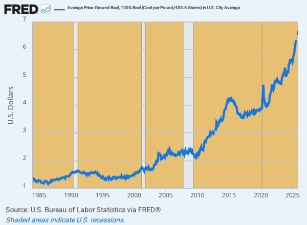 No more. At $6.69 per pound in December 2025, the price was up by +72% from where it stood on the eve of the pandemic in February 2020: In round terms, the cost of even hamburger meat has therefore risen at a 10% per annum rate for six years running.