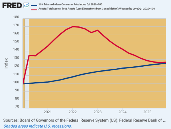 And on that score, both parties have spent like drunken sailors and urged/endorsed/endured the Fed’s printing press monetization of all that debt. As shown in the graph below, the Fed’s balance sheet is still up by 25% from its February 2020 level, and the 16% trimmed mean CPI is is also up by 25%.