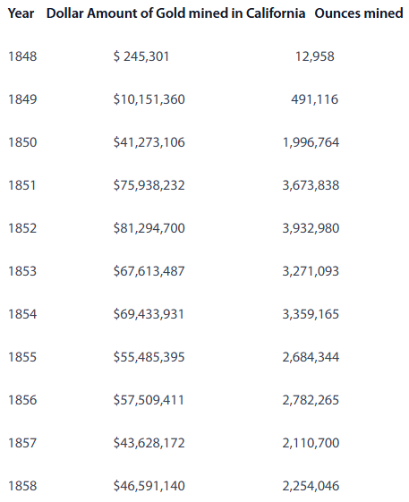 Gold production soared each year from the initial discovery in 1848 to a peak in 1852. In February 1851, the state’s largest newspaper reported,