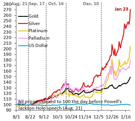 My government overlords and their legacy media propaganda outlets tell me the economy is booming because GDP is between 4% and 5%, the stock market is near all-time highs, inflation is declining, unemployment is low, and AI is going to transform our world for the better. According to their narrative, All is Well. Meanwhile, all hell is breaking loose in every facet of our everyday lives. We are seeing 6 sigma (once in 500 million) events in multiple markets (gold, silver, JPY bonds) within one week. Well functioning non-manipulated markets based on price discovery do not crash by 40% in one day, like silver did last week.