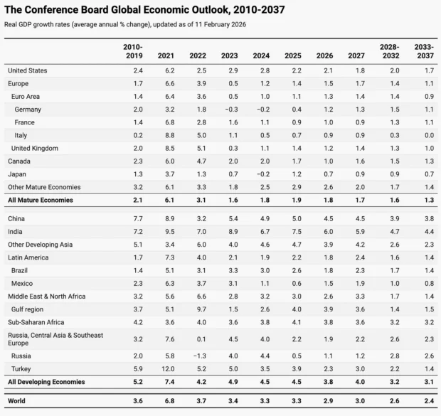 The Conference Board is the leading tabulator of the economic performance of the U.S.-and-allied economies, and hides whom its funders and biggest funders are, but its 2012 Annual Report disclosed in its pages 26-32 that its leaders represent prominent U.S.-and-allied mega-corporations. So, it represents the empire. It published on 11 February 2026, at https://www.conference-board.org/topics/global-economic-outlook: