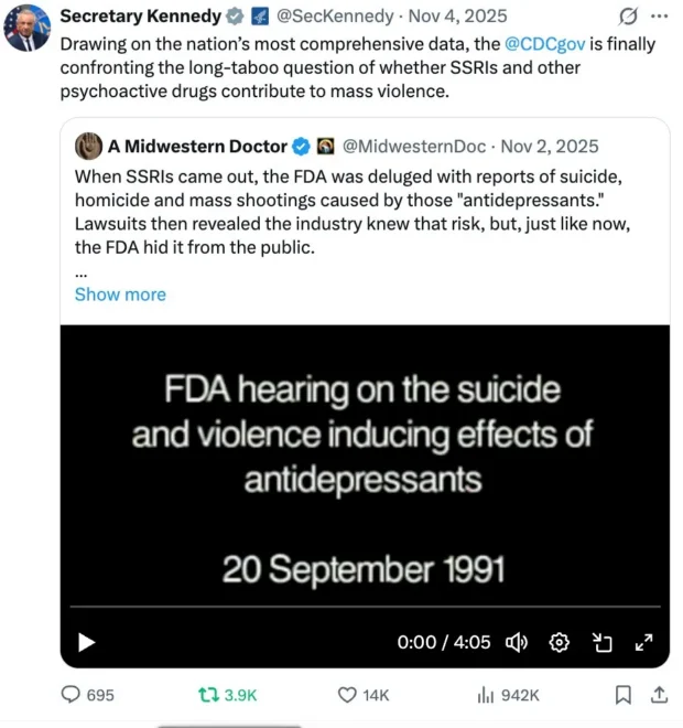 Note: antidepressants were marketed on the basis “depression is a chemical imbalance” (brain serotonin deficiency) despite no evidence supporting this, and it is only in recent years this has begun being acknowledged. Furthermore, autopsy studies of individuals who committed suicide (e.g., this one and this one) found they actually had elevated brain serotonin levels—providing a potential mechanism to explain how SSRIs trigger suicide.