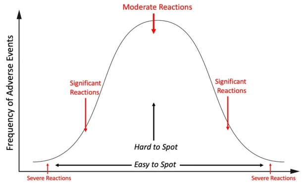 In toxicology, you will typically see severe and extreme reactions occur much less frequently than moderate reactions: