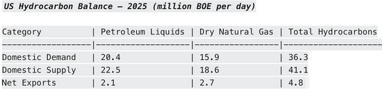 Accordingly, as shown below the USA in 2025 produced 41.1 million BOE/day of combined oil and gas, which well exceeded domestic demand of 36.3 million BOE/day. The latter went into the slate of refinery products sold domestically and the pipeline delivery of nat gas to domestic end markets.