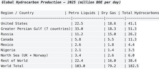 In short, the global hydrocarbon market is highly integrated and with the rise of the LNG sector and growing LNG tanker fleet has become more seamless than ever under the one price rule of markets. In this context, the US production in 2025 of 41.1 million BOEs per day of petro liquids and nat gas was nearly as large as the 51.3 million BOEs per day coming out of the Persian Gulf. ( (Saudi Arabia, Iraq, UAE, Iran, Kuwait, Qatar, and Oman).
