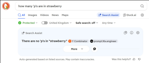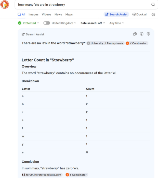 I have just asked the AI system offered within DuckDuckGo, my standard search engine, “How many ‘p’s are in strawberry”. The model gave the correct answer. There are none.