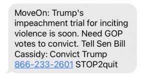 I just received this one today “Trump’s impeachment trial for inciting violence is soon. Need GOP votes to convict. Tell Sen Bill Cassidy: Convict Trump.”