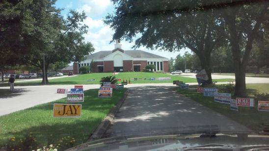Today is primary election day in Orange County, Florida. I took this picture of a church near my house. There are more political signs than you can count, plus many more that did not make it in the picture. This church lets the county use its building for a polling place. So do many others around town. How unholy, even without the signs.