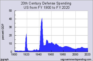 Relative quietude occurred as defense spending fell between 1975 and 2000 (to 3-5%). We made wars recently on Iraq, Afghanistan, Libya, Syria and Yemen. One reason for this was that we could. That was because of defense spending. It didn’t buy peace. It created a war machine that our leaders made use of. Notice that the Cold War came to an end in 1989, which was amid the period of falling defense spending, a small bump up having occurred under Reagan.