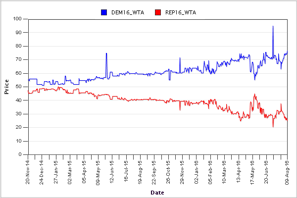 Clinton is hitting Trump harder than he’s hitting her. His style in winning the nomination has not borne fruit among the broader electorate. Clinton has held an uninterrupted lead ever since the market opened in November of 2014. With some volatility, it has widened as the election grew nearer. There’s still some uncertainty; Trump’s last chance is the debates.