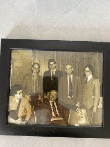 Below is a picture that was taken during Hayek’s visit to GMU. Hayek pointed out to me that we happened to be wearing the same Adam Smith ties! To my left is James Bennett and to my right is Jack High, two GMU economics department colleagues. Hayek signed the book that is in my hand which of course I still have.